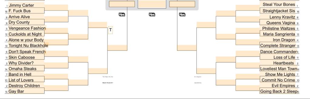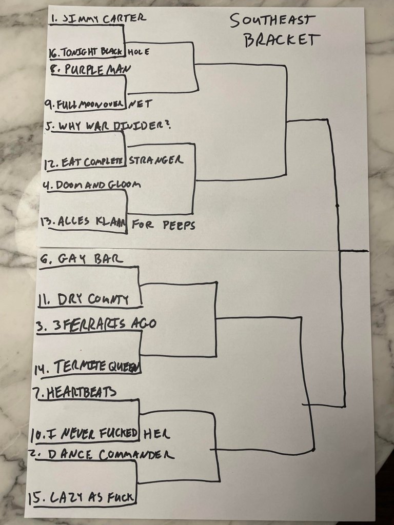 It’s done in tournament style, with 64 of his songs entering his version of the hugely popular NCAA’s March Madness. There’s a bracket, of course, and all songs are seeded.
