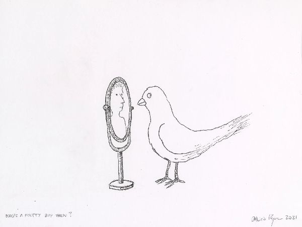 *Featured image is Stanza looking at a picture of himself painted by Mark Seabrook. Bottom image is a drawing by David Byrne.