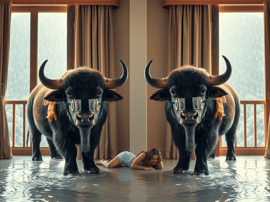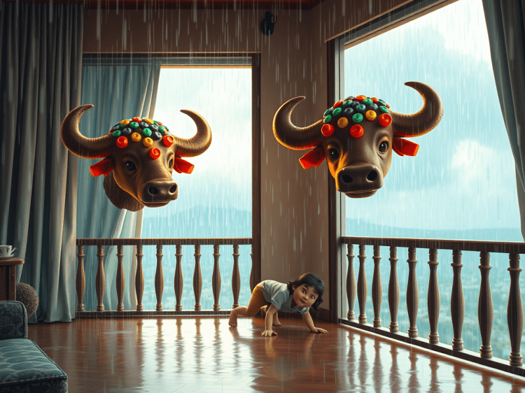 Then they told us to crawl under the buffaloes for fun. We were assured it would be safe. It was pouring rain and both balconies were flooded.