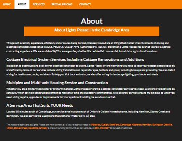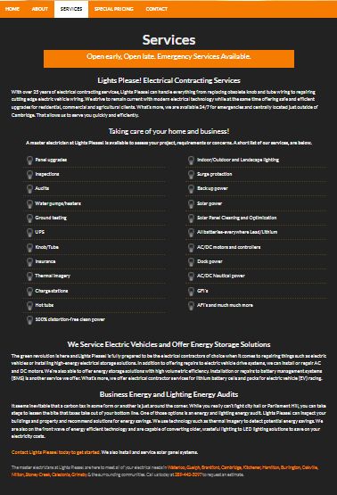 I wrote a website for an electrician company called Lights Please! from scratch and then later added 3 pages of paid SEO content. Itβs been live for about 2 years, which is an eternity in the online world, and really cool. At the same time, I hope my writing is even better now. π