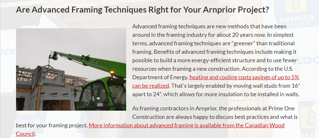 I discovered “Advanced Framing Techniques” while researching for this project. It is an interesting building method that is more sustainable and can also save on HVAC costs so I included that information. I made really long links to try to add strength to the keywords and highlight benefits. I also included a link to a Bob Vila webpage, who is synonymous with home construction.